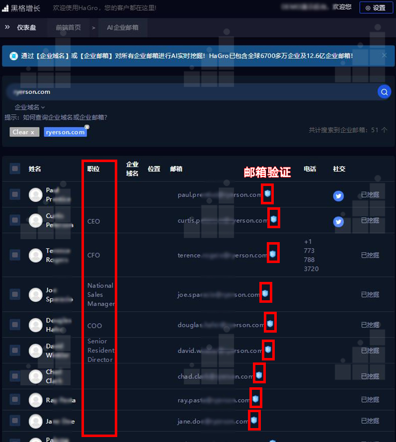 沒有(已有)目標客戶,挖掘行業(yè)相關企業(yè)決策人:輸入關鍵詞,通過對職位、地區(qū)等條件的篩選,直接匹配相對應的企業(yè)采購決策人信息,快速獲取企業(yè)采購決策人的多種聯(lián)系方式,并進行郵箱有效驗證。