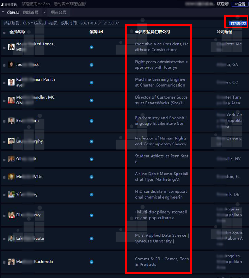眾所周知,領英是海外眾多企業(yè)高層的聚集地,通過關鍵詞直接定位行業(yè)內(nèi)相關領英會員,通過會員信息判斷其是否具有采購決策能力,確定之后,進行群加好友操作,進行潛客開發(fā)。