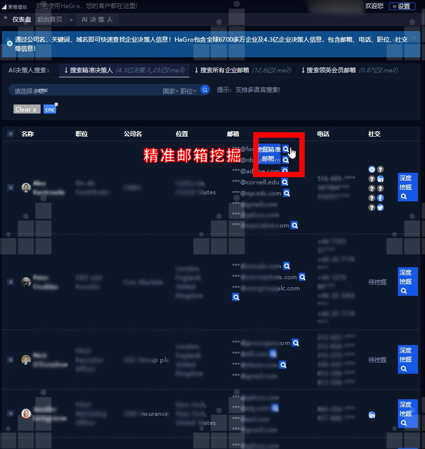 精準(zhǔn)郵箱挖掘→對(duì)決策人進(jìn)行搜索時(shí),精準(zhǔn)挖掘某個(gè)指定郵箱: