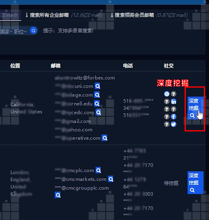 深度挖掘→對(duì)該目標(biāo)決策人進(jìn)行深度挖掘獲取郵箱、電話、社交等更為全面的信息: