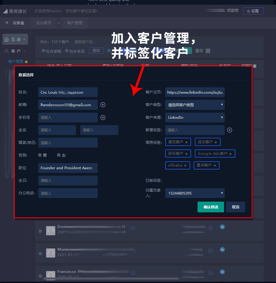 通過【Facebook互動池】和【LinkedIn互動池】中的關(guān)鍵詢盤信息,外貿(mào)人可以快速鎖定潛在客戶,然后通過黑格增長的管理客戶功能,把潛客加入管理,打上標簽,留下備注,利于在假期結(jié)束后重點進行開發(fā)。