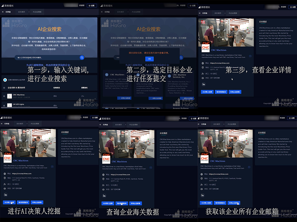 同時(shí),HaGro【黑格增長】建立了【AI決策人挖掘】、【海關(guān)數(shù)據(jù)查詢】、【所有企業(yè)郵箱搜索】三大功能的跳轉(zhuǎn)接口,可以直接對該企業(yè)的采購決策人進(jìn)行挖掘、對該企業(yè)的海關(guān)數(shù)據(jù)進(jìn)行查詢,并可直接搜索該企業(yè)的所有企業(yè)郵箱。