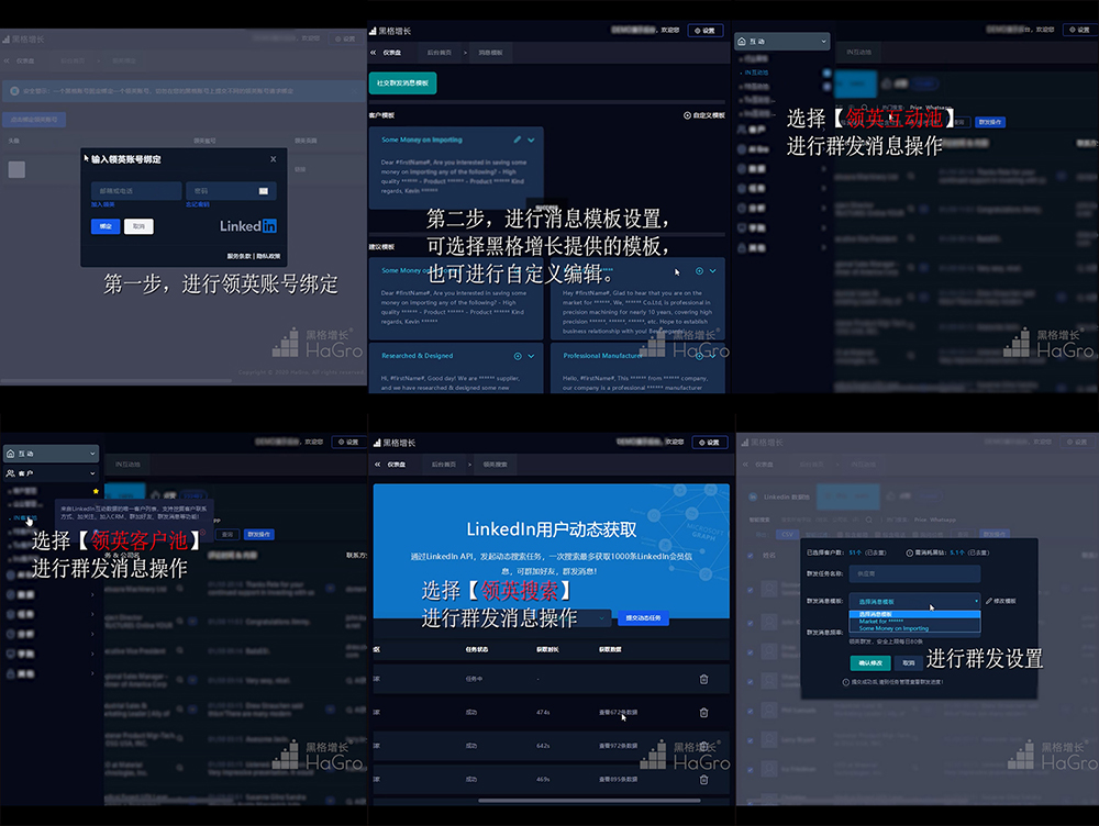 【領(lǐng)英群發(fā)】,通過對行業(yè)內(nèi)領(lǐng)英會員進(jìn)行消息群發(fā)。眾所周知,通過領(lǐng)英開發(fā)客戶,只能進(jìn)行一對一的消息發(fā)送,無法實(shí)現(xiàn)消息群發(fā),而HaGro【黑格增長】的【領(lǐng)英群發(fā)】功能便為外貿(mào)企業(yè)創(chuàng)建了群發(fā)消息的接口,幫助企業(yè)更好地實(shí)現(xiàn)自動化營銷。