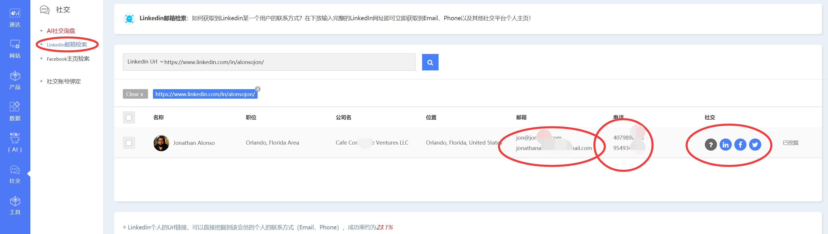而全球搜的數(shù)據(jù)大師,對這個尷尬的難題就有很好的解決方式。LinkedIn 郵箱檢索功能,通過聯(lián)系人URL,快速檢索出聯(lián)系方式以及社交信息,刻畫客戶的完整畫像,是了解客戶,跟進客戶的絕佳方式。