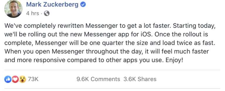 關于Facebook的最新資訊:Facebook將會對Messenger進行架構優(yōu)化,壓縮應用程序大小,相比之前,其訪問速度會提高到原來的兩倍,因為更新,Messenger中的某些功能將暫時不可用,有些選項卡也會被移除,但通過搜索還是可以找到。 Facebook首席執(zhí)行官馬克·扎克伯格(Mark Zuckerberg)也在社交平臺上表示,與其他用戶使用的應用程序相比,其速度和響應能力將明顯提升!