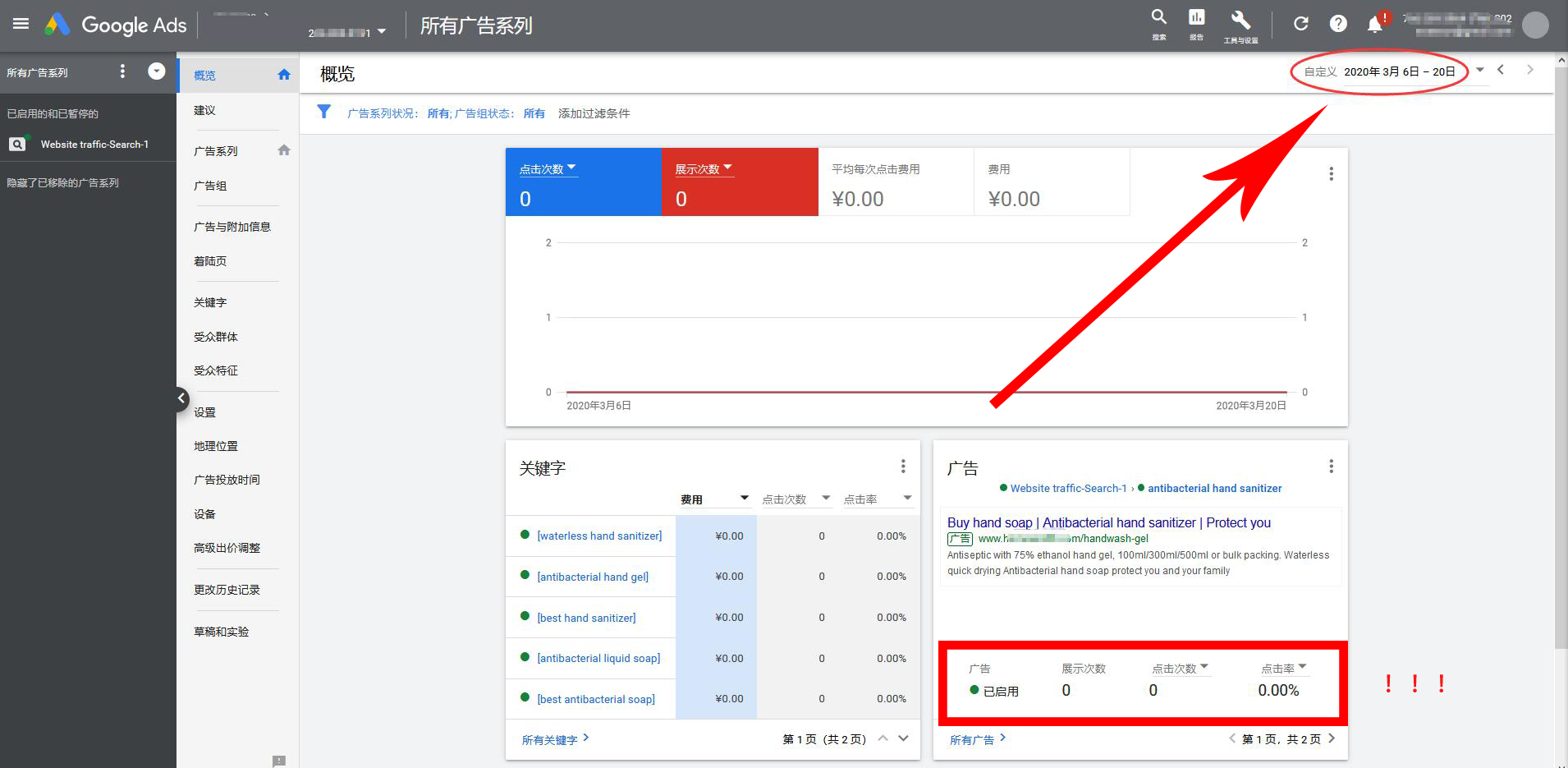 下圖為小編親測(cè):【抗冠狀病毒洗手液】廣告的投放!上架兩周,廣告狀態(tài)已通過審核!但0展示!0點(diǎn)擊!