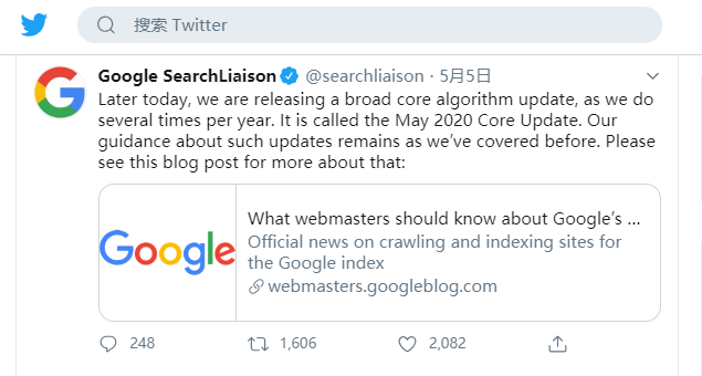 谷歌的官方發(fā)言人,丹尼·沙利文(Danny Sullivan)5月4日在Twitter上明確表示:谷歌在5月4日正式啟動了這次的算法更新。并命名為:2020年5月核心更新。