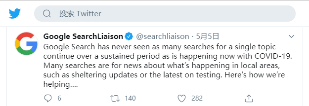 谷歌也表示:谷歌搜索從未見過像COVID-19這樣,對單個主題的搜索持續(xù)時間如此之長。許多搜索都是有關(guān)本地正在發(fā)生的新聞,比如最新的消息和最新的測試結(jié)果等。也就是說,疫情已經(jīng)改變了人們的搜索習慣以及需求。