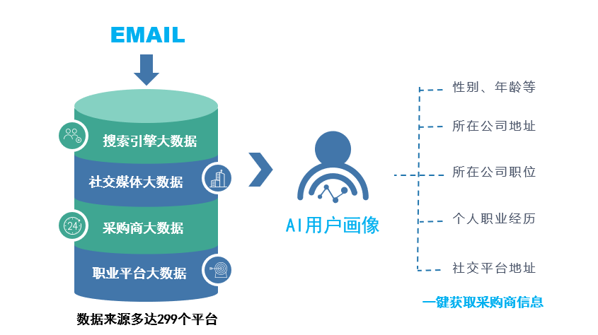 AI用戶畫像功能,通過一個(gè)Email,就可以查詢到這個(gè)“采購(gòu)商”的性別、年齡、公司職位、職業(yè)經(jīng)歷、教育經(jīng)歷、社交主頁等信息,讓主動(dòng)開發(fā)更有保證!