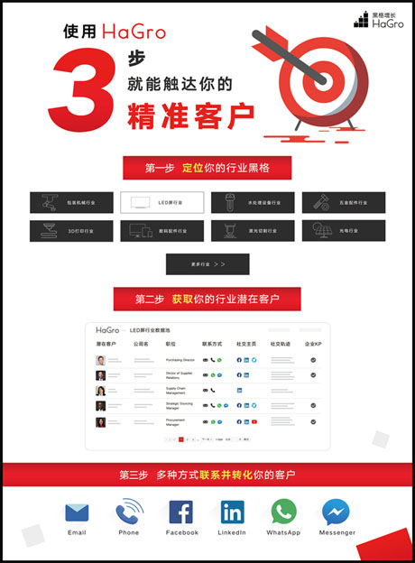 黑格增長(zhǎng)(HaGro),以當(dāng)下最具潛力的社交媒體獲客為基礎(chǔ),通過(guò)AI人工智能挖掘行業(yè)行為大數(shù)據(jù),賦能外貿(mào)企業(yè)更簡(jiǎn)單、更高效獲取客戶(hù)采購(gòu)線索,將社媒獲客流程中的痛點(diǎn)層層擊破,實(shí)現(xiàn)社交平臺(tái)紅利裂變式增長(zhǎng),助力外貿(mào)獲客輕松實(shí)現(xiàn)“黑格增長(zhǎng)”!